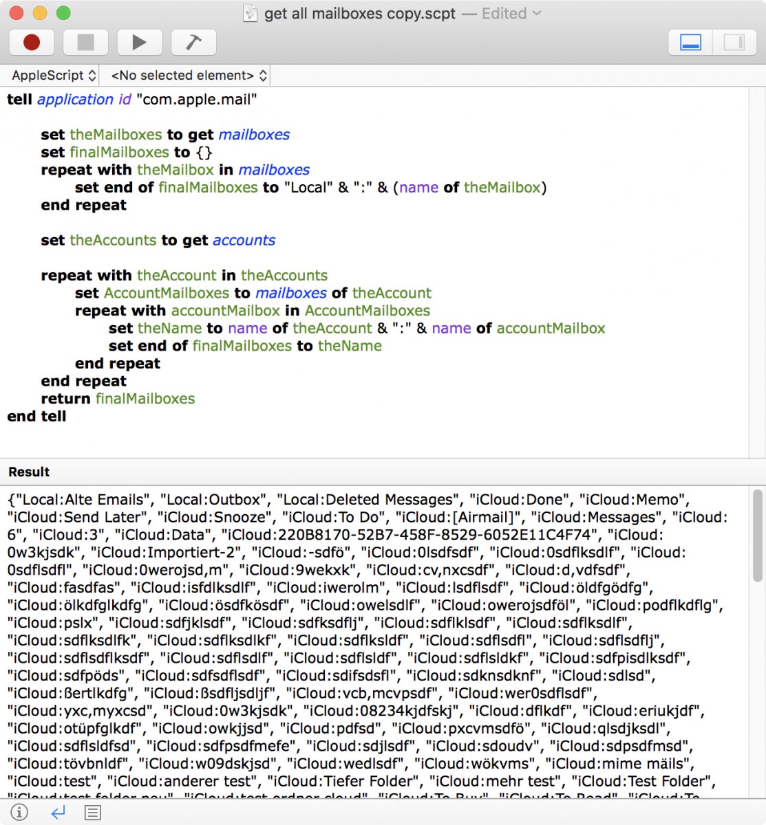 I have quite a few email accounts in AppleMail. A couple of accounts have more than a handful of mailboxes. Most users have lots and lots of mailboxes. It's not possible to search for a mailbox in AppleMail. We are going to use AppleScript to make a list.