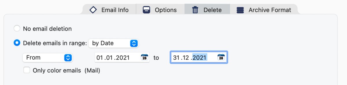 Mail Archiver can delete emails for Mail, Outlook and IMAP. Even though Mail Archiver always checks if an email is in the archive deleting data can be scary. To alleviate that it's possible to give the emails a blue background instead of moving them to the trash: