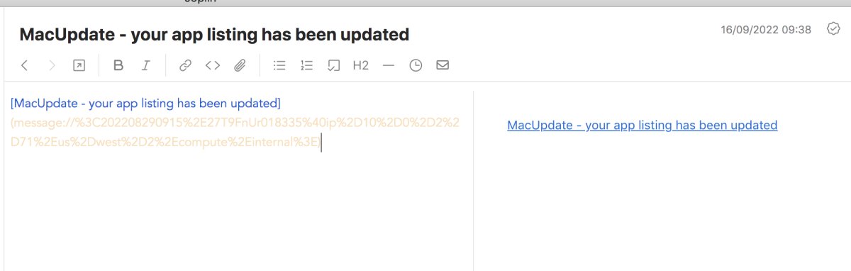 If you create a note or a to-do in a note taking app for an email in the Inbox of Mail it makes sense to refer to the original email. 2 months ago John Vorhees ran a story in MacStories about creating a MarkDown link in Shortcuts to any email in Mail. I'll offer a variation of the AppleScript below with correct encoding and an Alfred workflow.