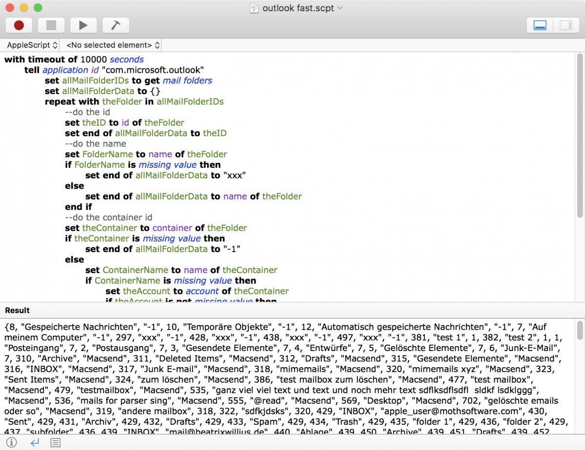 Some months ago I showed you how to get a nicely formatted list of mailboxes out of Outlook. A Mail Archiver user contacted me and said he would get the beachball when archiving to Outlook. We did a screensharing session and I found out that he had 500 mailboxes in Outlook. The AppleScript to get the mailboxes took 2 minutes. Blech!