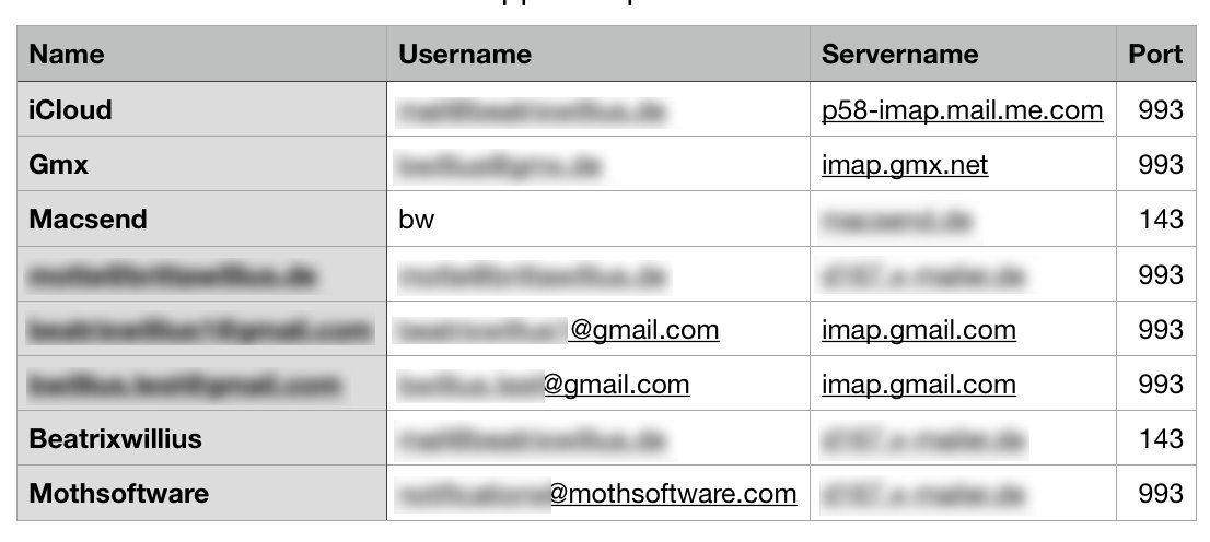 User Mario wants to archive 120 accounts in Mail Archiver. For testing I usually have some account information at hand. But the account window in Mail is rather small.