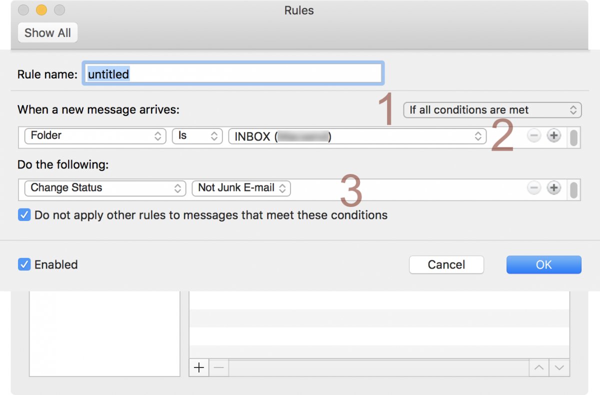 Creating a rule is quite similar to AppleMail. I can give the rule a nice name. Then there are areas for the conditions (2), the actions (3) and if all rules or any rule should be applied (1).